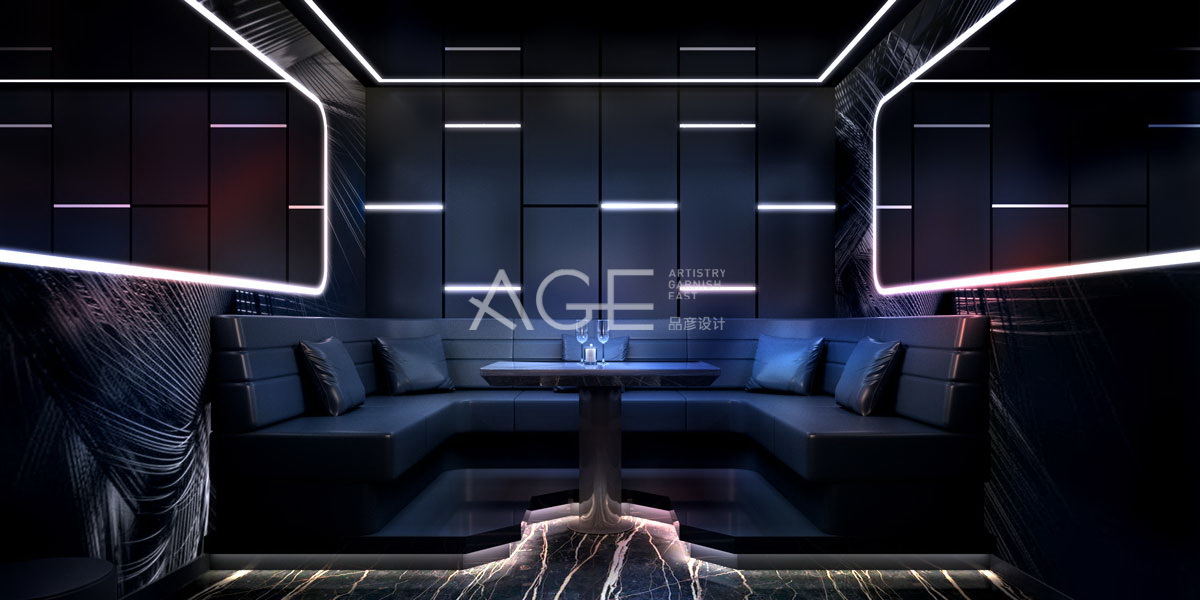 科技感的包厢在此项目中是最抢眼的设计。吊顶边角弧形走线,明灯顺势镶边,线条流畅舒缓,墙面6只金粉色装饰的飞鸟有静态高贵之美。顶部镜面铺就,层层倒映缩影,有穿越未来之感,在灯光作用下,星光摇曳,魅力无限。灰色长方形板块交错的背景再用上下错落的短灯装饰,左右墙面以及顶面采用镜面设计,空间向左右延伸,如奔跑的旋律,缓和深色系的硬朗气质。宽敞的U形沙发摆放设计,与镜面灯光浑然一体,营造轻松的享受空间。